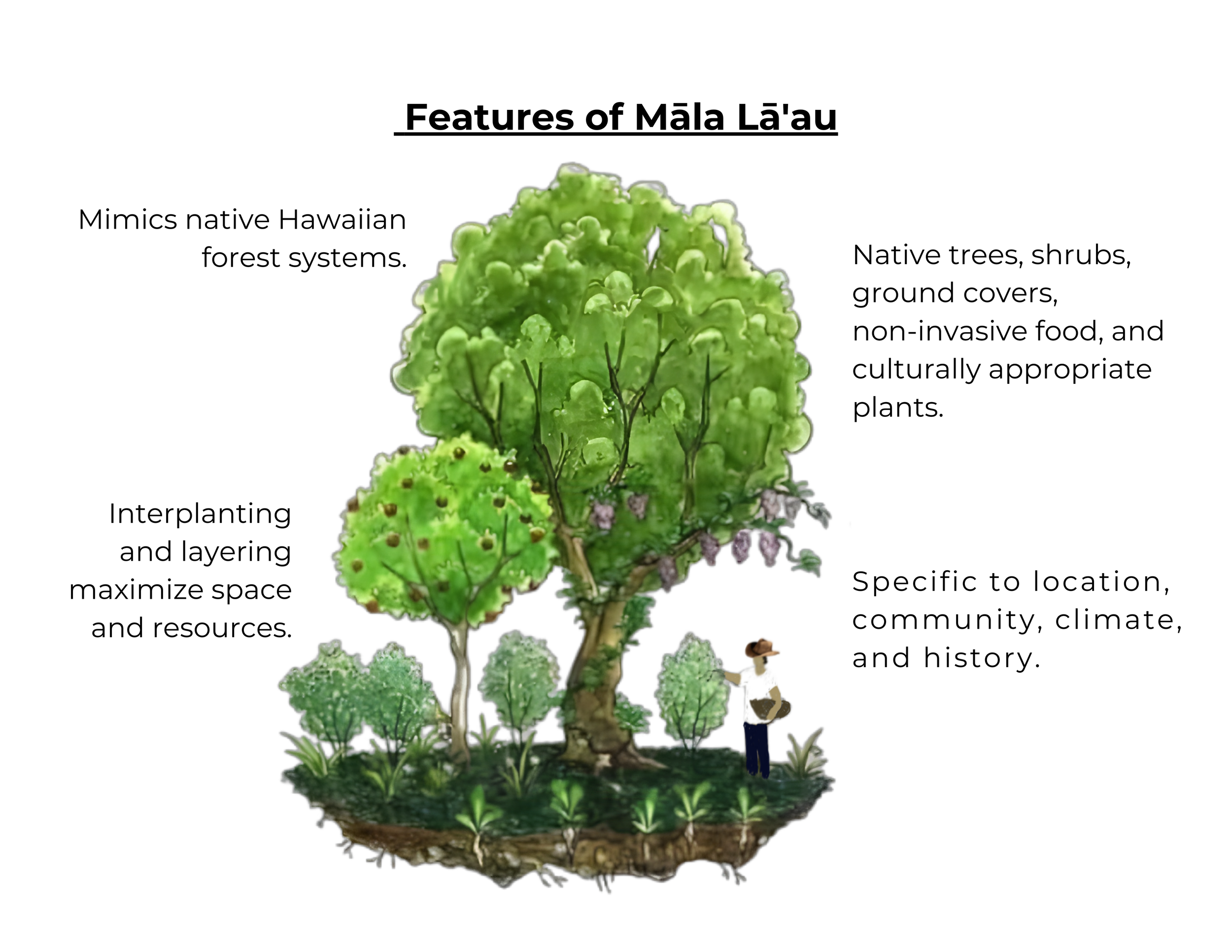 Diagram of a Māla Lā'au, showing native Hawaiian forest elements, various trees and shrubs, layered planting for space optimization, and a person standing near the trees with descriptive labels.