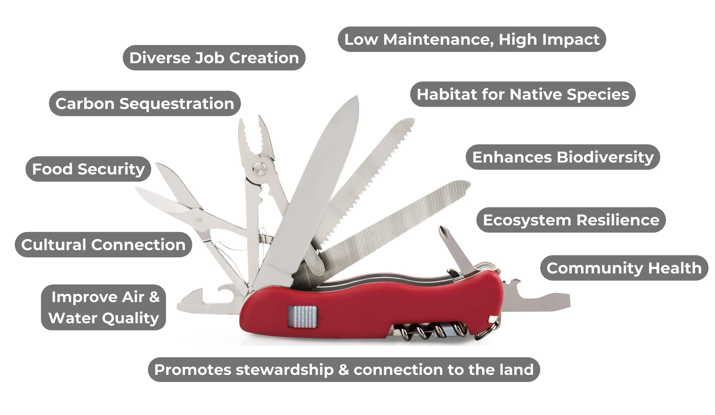 Multitool with various blades and tools labeled to benefits such as carbon sequestration, food security, cultural connection, improving air and water quality, promoting stewardship, low maintenance, habitat for native species, enhances biodiversity, ecosystem resilience, and community health.