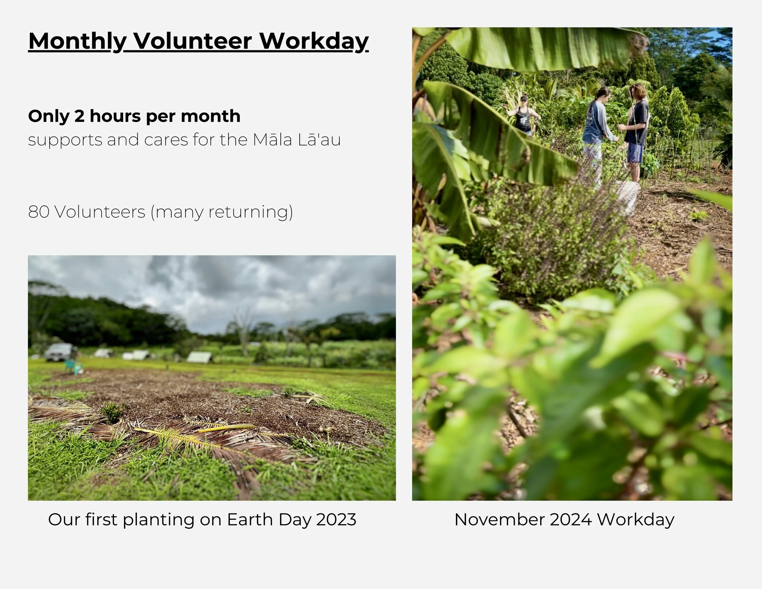 A presentation slide titled 'Monthly Volunteer Workday' with a subtitle 'Only 2 hours per month supports and cares for the Māla Lā'au'. The slide shows two photos; the left photo depicts a garden with a newly planted area, labeled 'Our first planting on Earth Day 2023', and the right photo shows volunteers in a lush garden, labeled 'November 2024 Workday'.